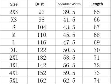 Sizes: 2XS, XS, S, M, L, XL, 2XL, 3XL, 4XL, 5XL